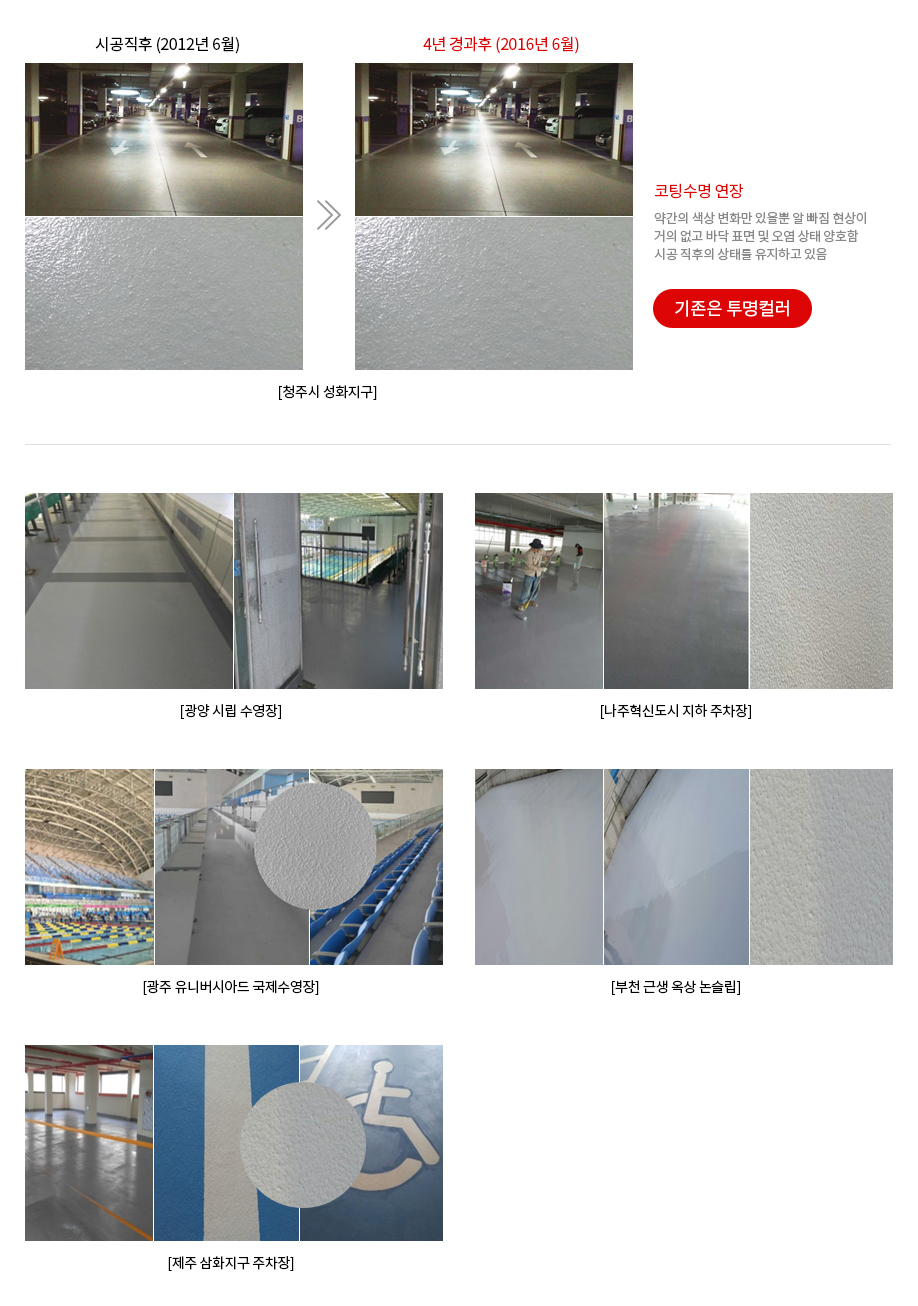 - 논슬립 및 소음방지 효과 미흡 - 도료 사용량 많음 (고점도 도료 사용, 후막 시공) - 제한적 구분 구획시공 |