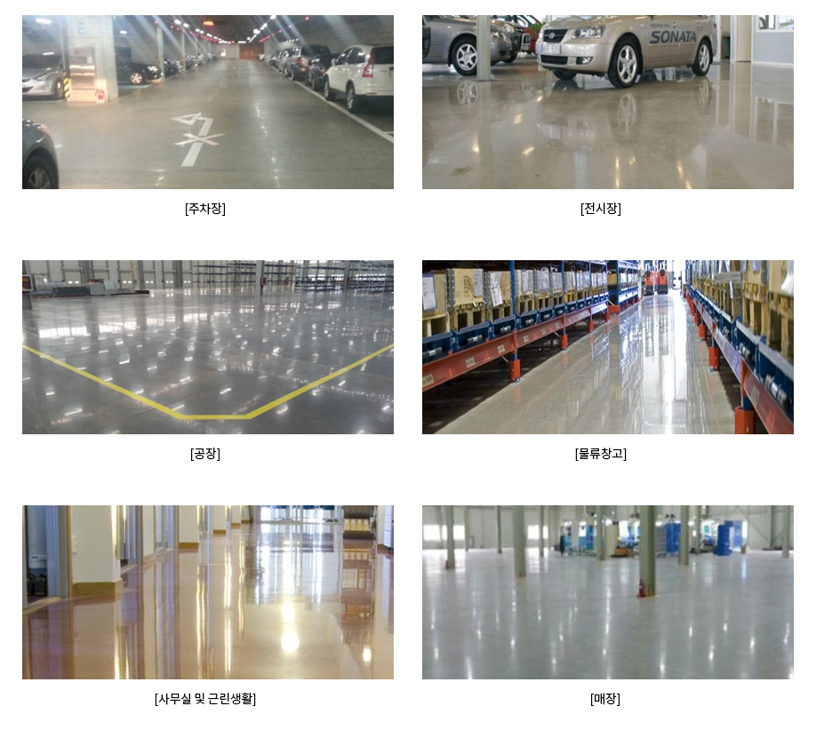 즉 콘크리트나 시멘트 몰탈을 타설한 그대로 사용하면 시멘트성분의 미관상, 건강상 또한 강도저하등 등이 발생, 콘크리트에 침투성 표면강화제를 침투시켜 강도를 증대시키고 ,표면을 매끈하게 면처리 후 광택을 발현해